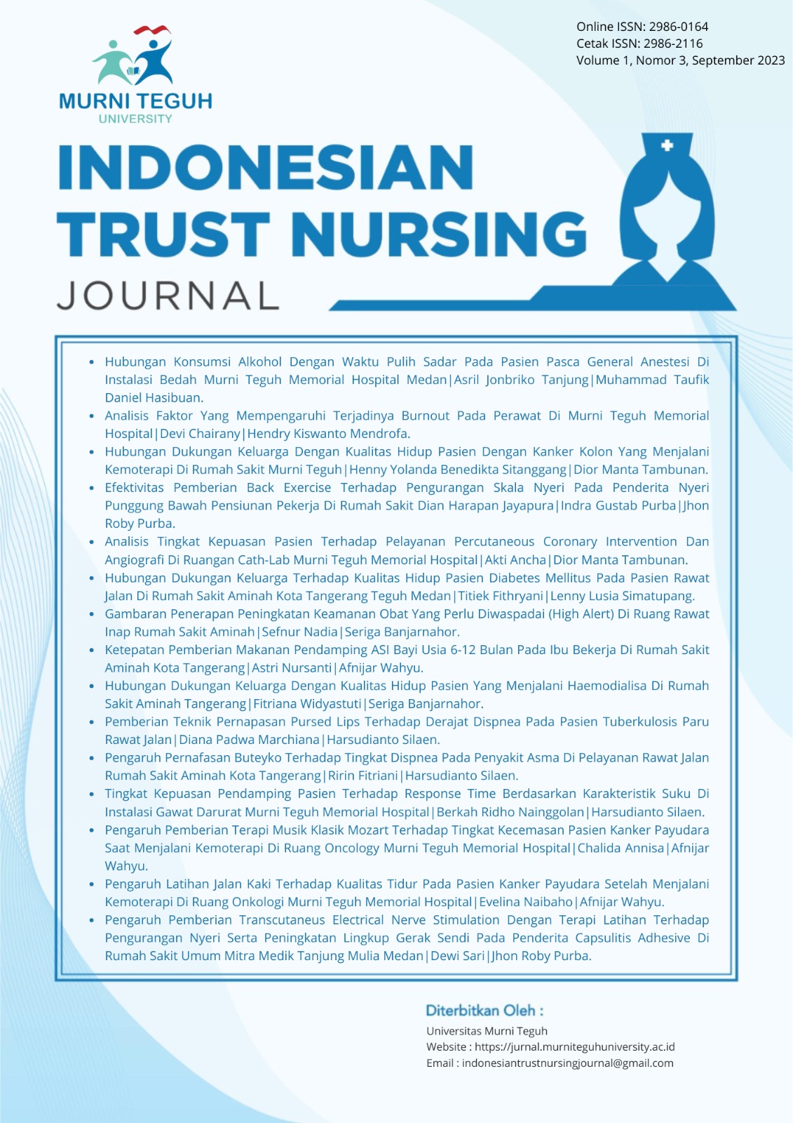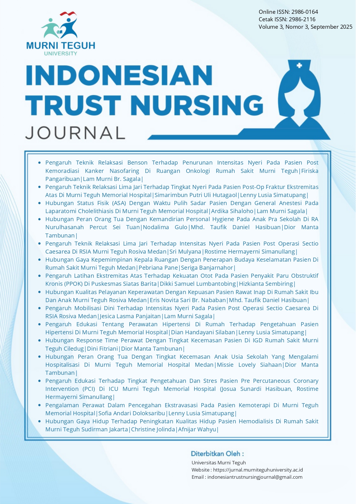 Vol 3 No 3 (2025)Indonesian Trust Nursing Journal adalah jurnal dalam bidang ilmu keperawatan yang memuat hasil penelitian atau kajian pustaka. Jurnal ini diharapkan menjadi wadah berbagi ilmu pengetahuan kepada profesi perawat untuk meningkatkan pengetahuan sehingga kualitas asuhan lebih optimal.
